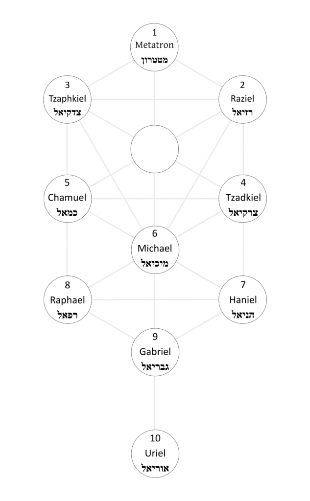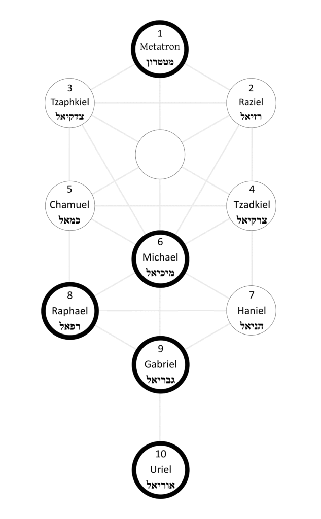 Raziel, Tzaphkiel, Tzadkiel, Chamuel, Haniel control the energies of the sephirot in which they reside.