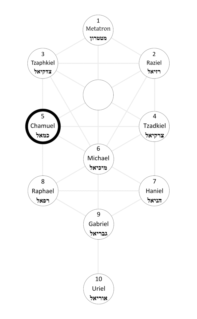 Archangel Chamuel resides in the 5th Sephira, Gevurah.