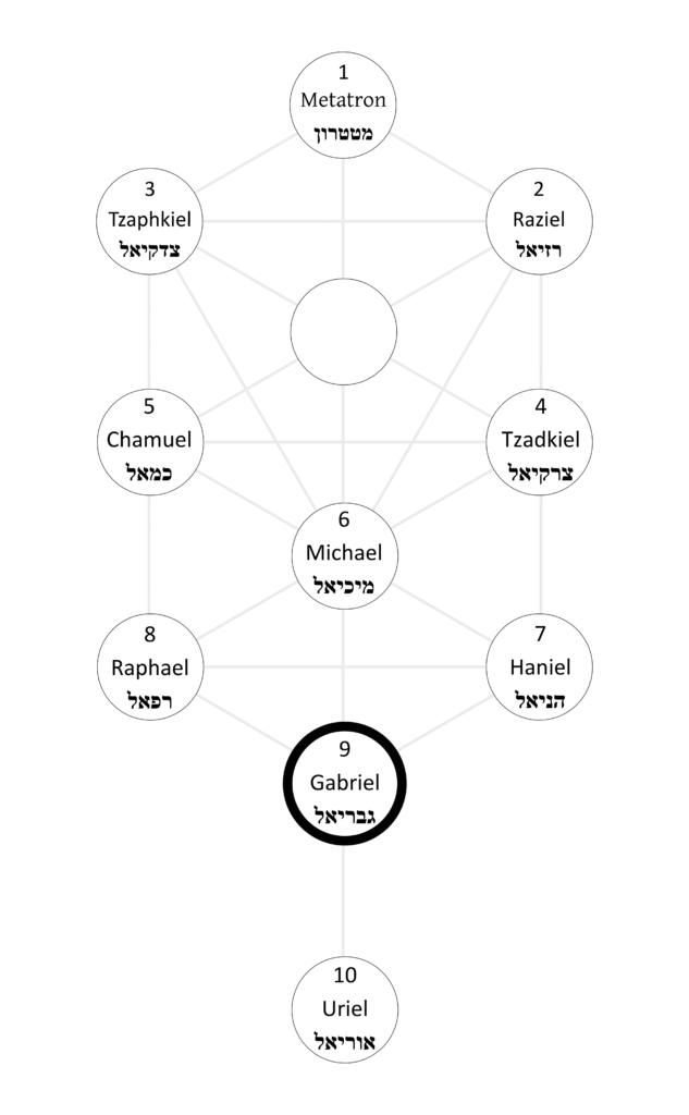 Archangel Gabriel resides in the 9th Sephira, Yesod. His domain is the moon.