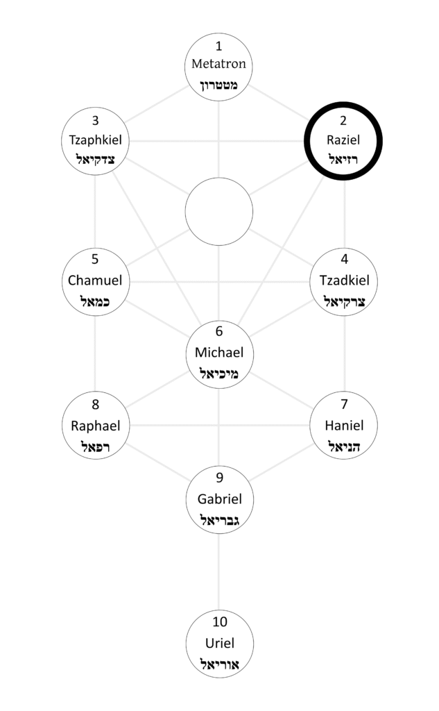 Archangel Raziel resides in the 2nd Spehira, Chokmah, Wisdom.